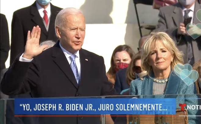 Luego de la actuación de Jennifer López, John Roberts, presidente de la Corte Suprema de Estados Unidos llevó a cabo el juramento de Joe Biden mientras su esposa, ahora la primera dama, sujetaba la Biblia, y a las 10:49 de la mañana, Biden se convirtió oficialmente en presidente de Estados Unidos.
