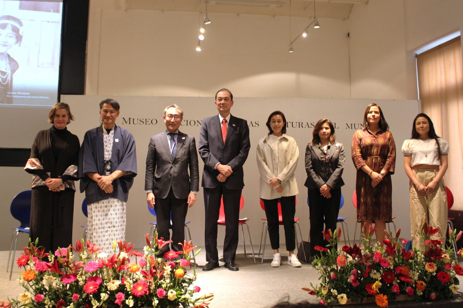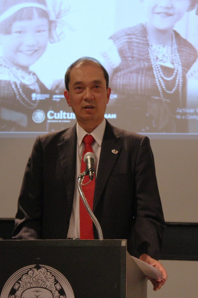 En el presidium estuvieron el embajador del Japón en México, Excmo. Sr. Kozo Honsei; Alejandra Gómez Colorado, Directora del MNCM; Toru Oono, director de Fundación Japón en México; Dahil Melgar Tísoc, investigadora del MNCM y curadora de la muestra; la señora Midori Iwadare, las señoras Sayuri y Midori Hayashida y Alejandro Takeda distinguidos miembros de la comunidad nikkei1 mexicana. De igual forma acompañaron el evento el CEO de CANON, Andy Ikeda; así como el embajador de Costa de Marfil en México, Excmo. Sr. Djerou Robert; entre otras personalidades.