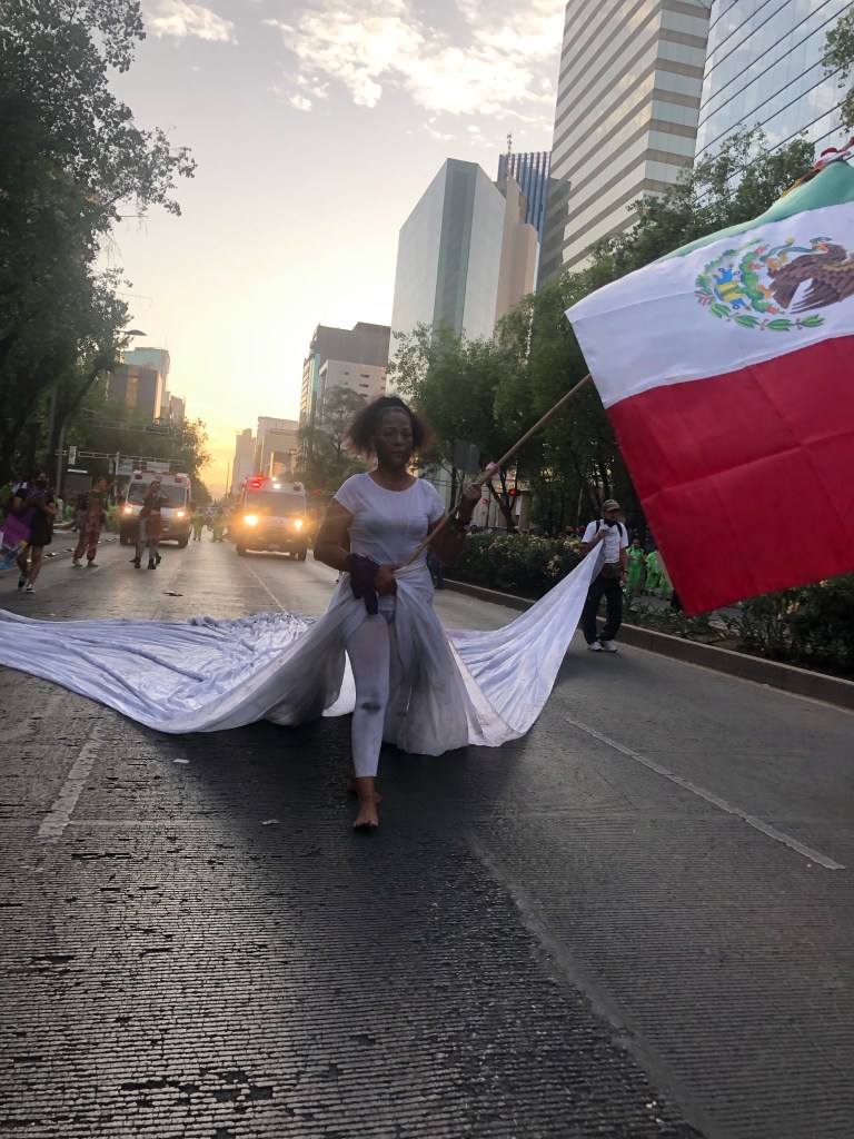 Al salirnos del contingente caminamos de regreso y fue cuando nos dimos cuenta que éramos el último contingente, y que al final de este, se encontraba una mujer vestida de blanco, arrastrando una gran cola blanca y portando la bandera de México. Su rostro lo decía todo.