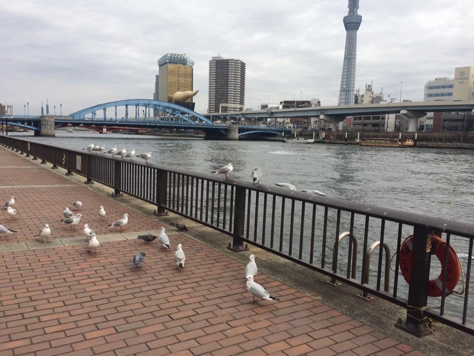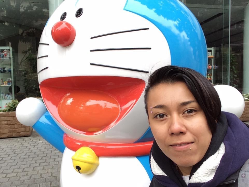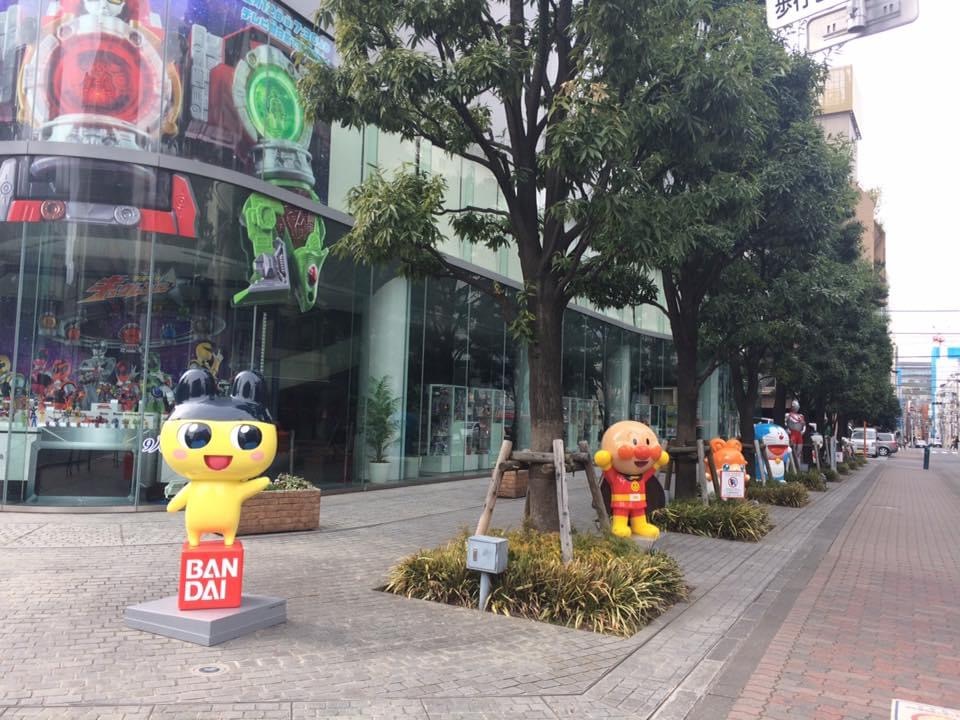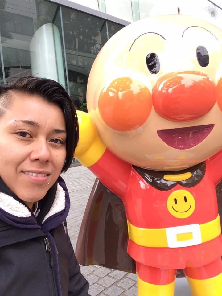 Llegué temprano, por lo que me puse a contemplar la vista del río Sumida y de la ciudad mientras me desayunaba un pan que había comprado en la estación de metro. Más tarde me fui a caminar por sus calles para ver qué encontraba, y di hasta el edificio Bandai, el cual tenía varias figuras de sus personajes en la banqueta, por lo que aproveché para tomarme una foto con Doraemon y Anpanman, personajes muy populares en Japón. Cabe mencionar que de paso me emocioné al ver una de miles de máquinas expendedoras de bebidas que hay en el país.